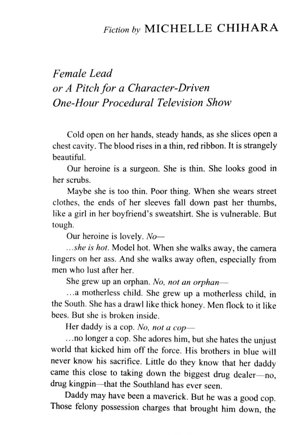 FEMALE LEAD - or - A PITCH FOR A CHARACTER-DRIVEN ONE-HOUR PROCEDURAL TELEVISION SHOW