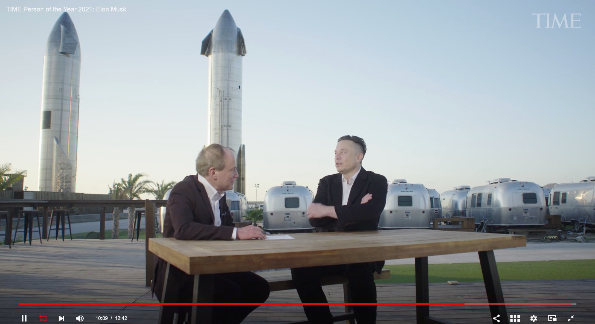 This screen shot is from his appearance in a TIME magazine video when he was named Person of the Year. He called the Space X campus a manly techno-monastery while sitting in front of the highly suggestive rockets pictured below.
