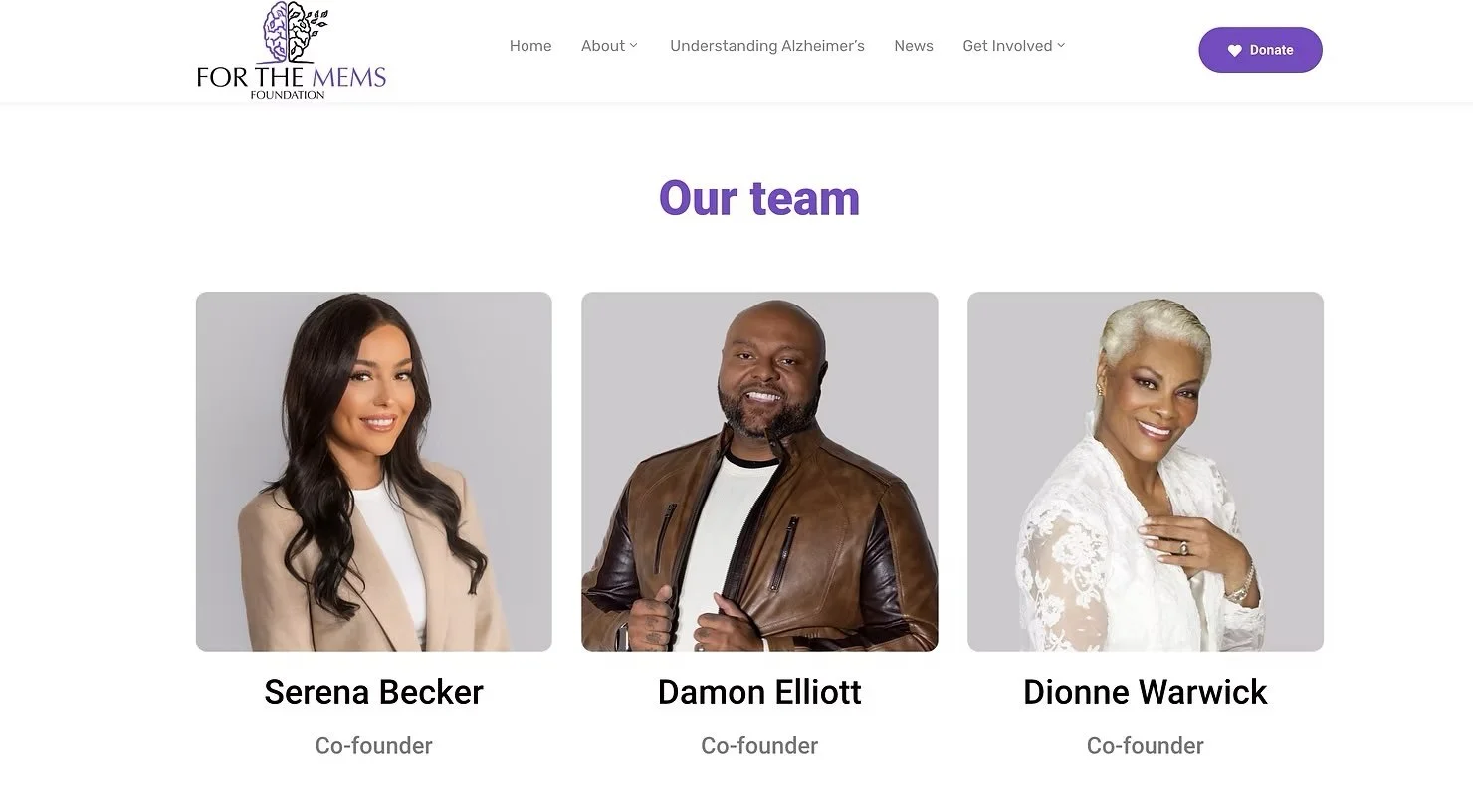 The website is barebones. There’s a stock photo of people in Volunteer t-shirts with a form where you can type in your name to sign up for unspecified volunteer opportunities. The News sections is a set of links to articles from the scientific press about Alzheimer’s drugs. The Team is identified as Elliott, the aging R&B superstar Dionne Warwick (yes, that Dionne Warwick), and a young woman named Serena Becker.